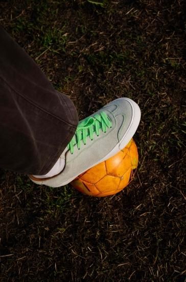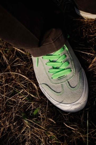 クリーム色のアッパーに蛍光グリーンが映える一足。